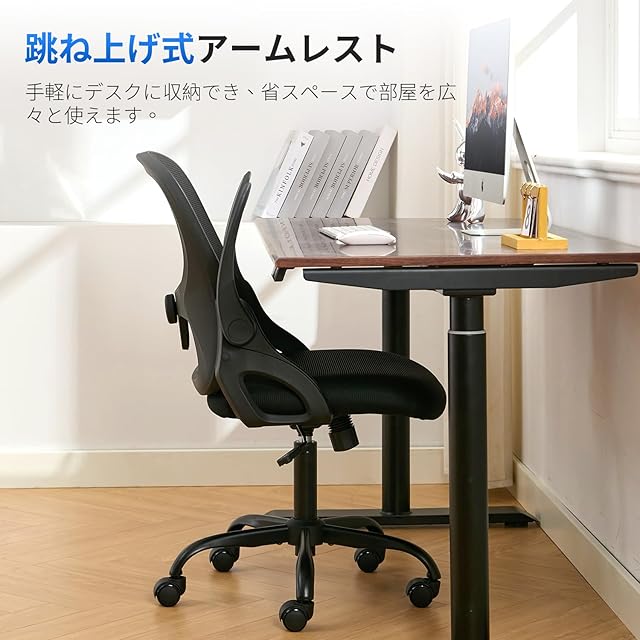 【跳ね上げ式アームレスト&消音キャスター】跳ね上げ式アームレストは90度回転可能です。使わないときはアームレストを引き上げて、机の下に収納でき、省スペースで部屋を広々と使えます。ナイロン樹脂ベース製のキャスターは、木製フローリング、タイル、カーペットなど、あらゆる床材に対応。床を傷つける心配がなく、長期間美しい状態を保てます。さらに、静音設計でスムーズに移動可能、オフィスや自宅でも、周囲を気にせず快適に使用できます。