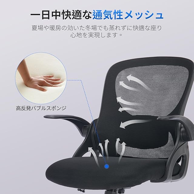 【高反発クッション&通気性抜群のメッシュ生地】デスクチェアの座面には、耐久性が高く型崩れがにくい高反発バブルスポンジを採用。もっちりとした高弾力で、長時間のデスクワークも快適にお尻をホールドします。背もたれと座面には、通気性の良いメッシュ素材を採用しました。メッシュの背もたれは空気を自由に流れさせ、汗を防ぎ、背中を涼しく保ちます。夏場や暖房の効いた冬場でも蒸れずに快適な座り心地を実現します。テレワークや勉強、オフィスワークに最適です。
