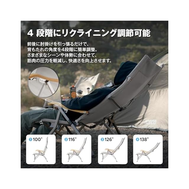 四段階のリクライニング機能:ハイバックの背面が四段階にリクライニング可能のアウトドアチェア。シチュエーションに応じて好みのポジションで寛げます。室内だけでなく、キャンプやバーベキュー、ピクニックで活躍します。