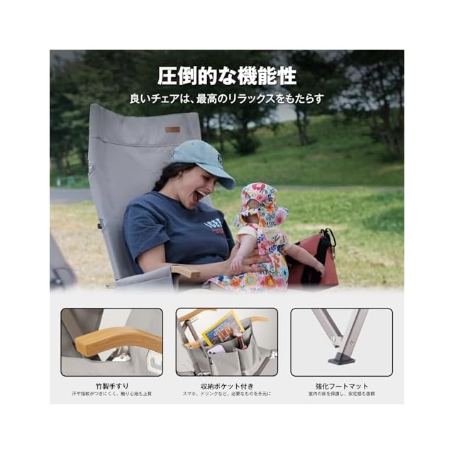 圧倒的な機能性、快適な座り心地を徹底追求!:側面着脱式ポケット付き、実際のキャンプでは「欲しいものがすぐ手に届く場所にある」という快適さに繋がってきます。竹製の手すりはオシャレだけではなく汗や指紋がつきにくい。強化フートマット、室内の床も保護する。