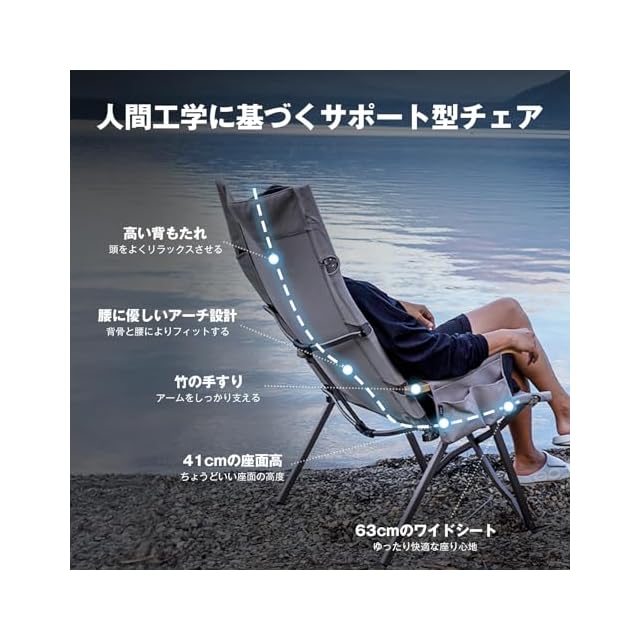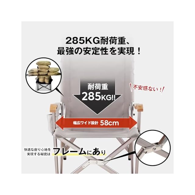 265KG耐荷重、最強の安定性を実現!:アウトドア椅子は1600Dポリエステル、A7075アルミ合金フレームを採用した設計で、265KGまでの耐荷重!さらに、座面を深くするし、ハンモックのように体にフィットし、ゆったりと包み込まれる最強の安定性を実現したアウトドアチェアです。
