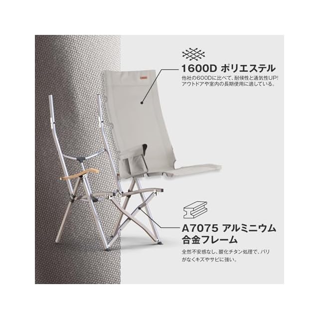 1600Dポリエステル、素材力満点!:ICECOは1600Dポリエステルを採用し、他社の600Dに比べて、アウトドアや室内の長期使用に適している。あつい季節も蒸し暑くなく、抜群の通気性と快適な座り心地を確保できます。座面の裏も防水加工し、雨でもタオルでちょっと拭くだけ座れます、雨に濡れてもカビにくい防カビ加工も施しています。通常のアウトドアチェアの座面幅は50cm前後、ICECOでは最大幅58cmのワイド設計を実現。体が大きい方でもゆったりとご使用いただけます。