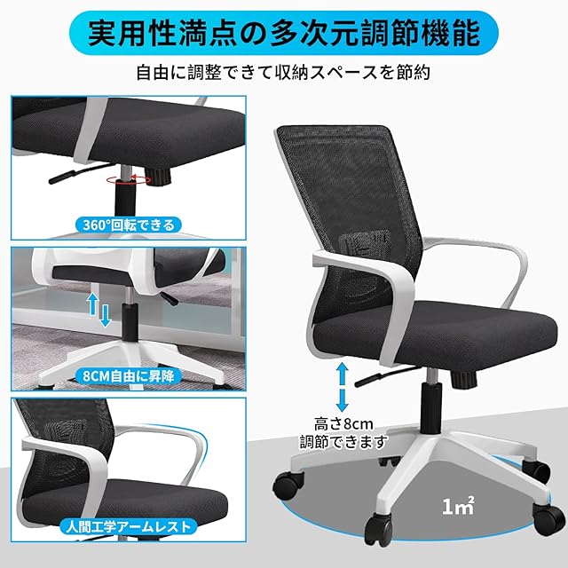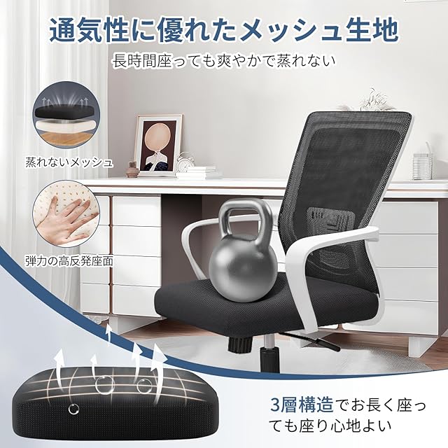 オフィスチェア デスクチェア 人間工学 テレワークチェア 10CM昇降 ロッキング機能 疲れない 椅子 厚手高反発クッション 360度回転 通気性メッシュ 腰サポート ナイロン樹脂ベース おしゃれ PCチェア ゲーミング/勉強/事務用 パソコンチェア (ホワイト)