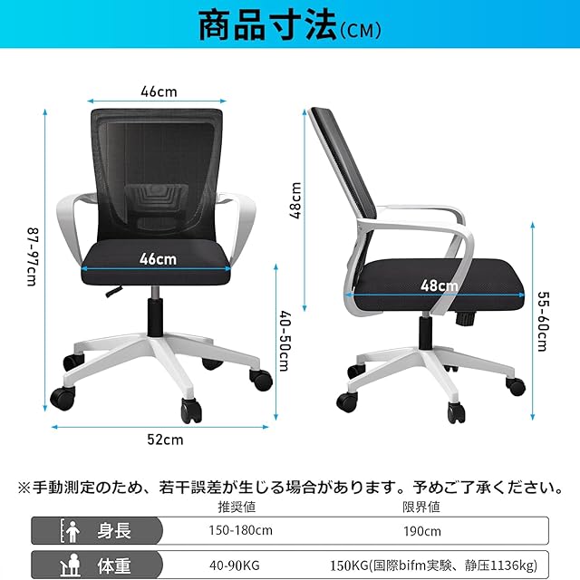 【15分間で簡単に組立可能・品質あり】オフィスチェアのサイズ:幅46×奥行52×高さ87-97cm(座面高:44-54cm、座面サイズ:幅46×奥行48×高さ6cm)。日本語の取り付け説明書と工具が付属しており、組み立ても簡単で、レンチが付属しており、一人で15分程度で簡単に組み立てることができます。安心:万が一商品到着後、初期不良・破損・取り付け方法が不明等の場合はお気軽にご連絡ください。返品、返金、取り付けるビデオを送させていただきます。