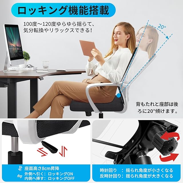 【リラックス背座ロッキング機能が搭載】 椅子は20度ロッキング機能を搭載し、座面と背もたれが繋がっていているチェアは座面と背もたれが20度角度で同時に可動します。体を動かすことでゆらゆらと揺れている。長時間の仕事や勉強の合間に、リラックスした時間をお過ごし、ちよっと疲れてしまったとの気分転換ができます。本体重量は10kgで強化ナイロン樹脂ベースを採用して静止耐荷重は約150KGに達しており、ご安心して利用いただけます。