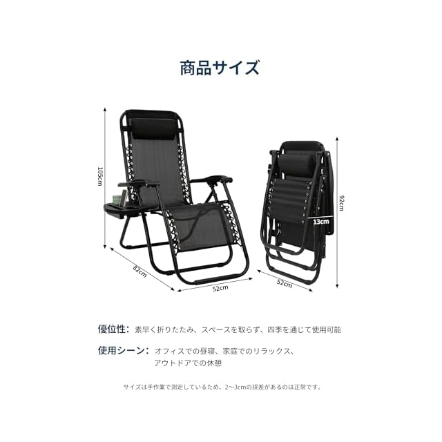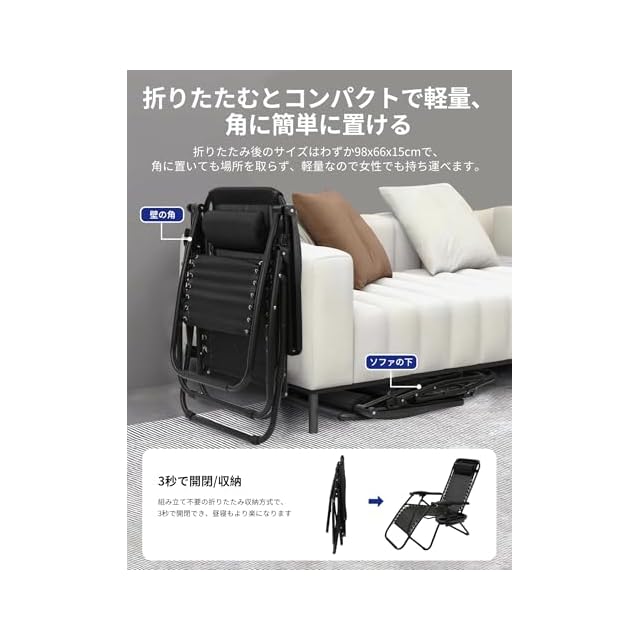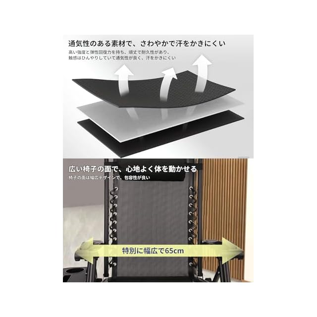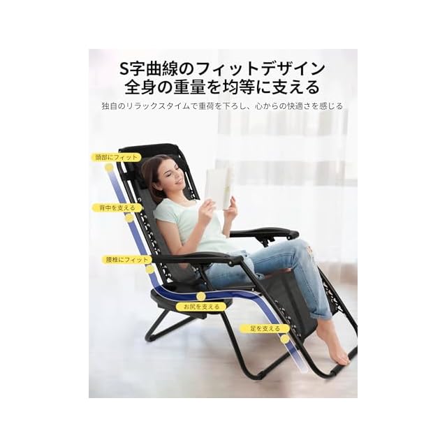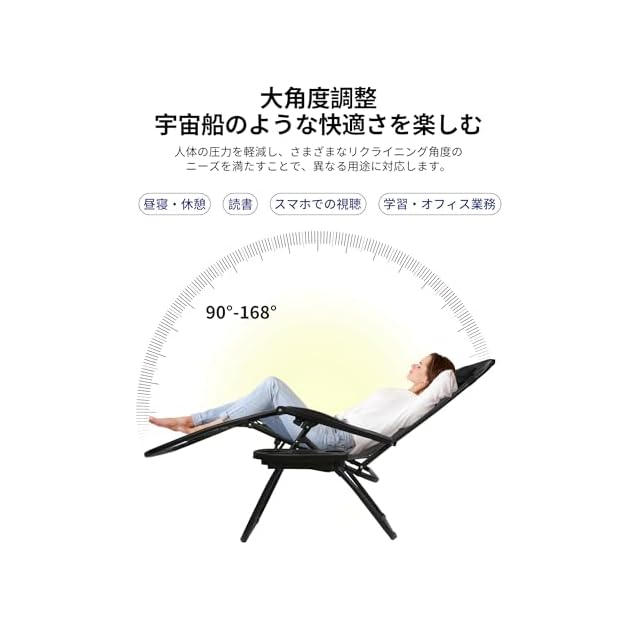 超耐荷材質:高品質の炭素鋼材質、強度が十分です。耐荷重(静止荷重)は余裕の約123kgです。ゼログラビティーアウトドアチェアはストレスフリーの無重量感覚で最大限のリラクゼーションを実現します。