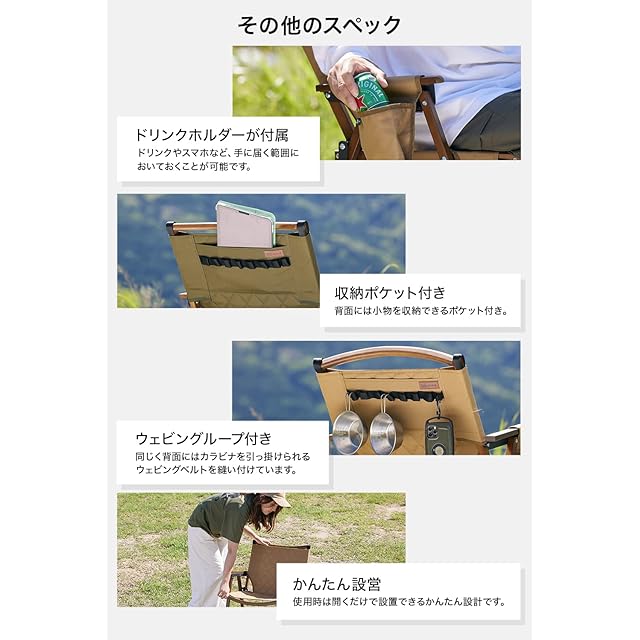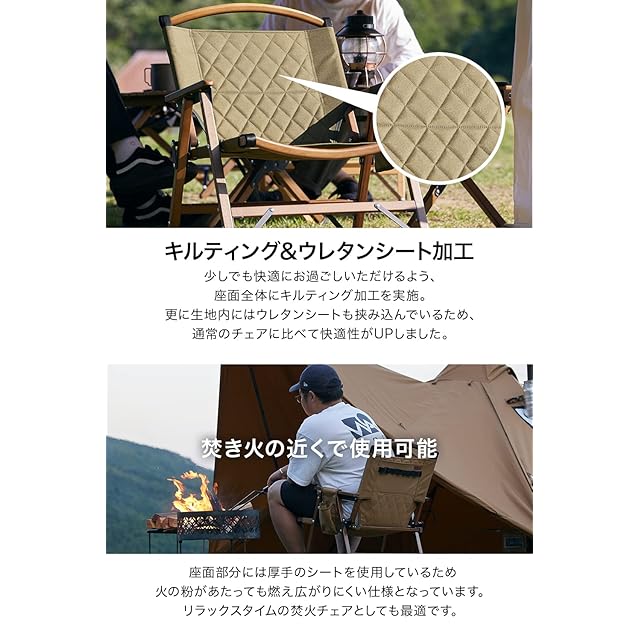 【焚き火の近くで使用可能】座面部分には厚手のシートを使用しているため火の粉があたっても燃え広がりにくい仕様となっています。リラックスタイムの焚火チェアとしても最適です。 【その他のスペック】・ドリンクホルダーが付属:ドリンクやスマホなど、手に届く範囲においておくことが可能です。・収納ポケット付き:背面には小物を収納できるポケット付き。・ウェビングループ付き:同じく背面にはカラビナを引っ掛けられるウェビングベルトを縫い付けています。・かんたん設営:使用時は開くだけで設置できるかんたん設計です。