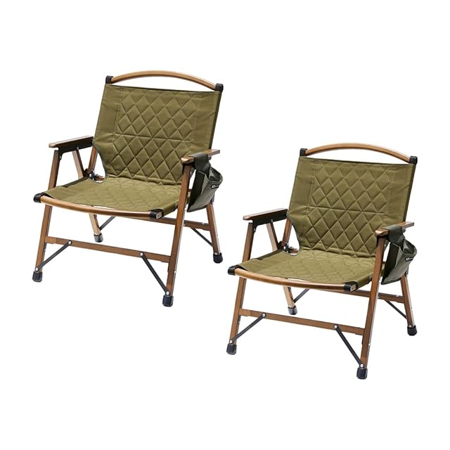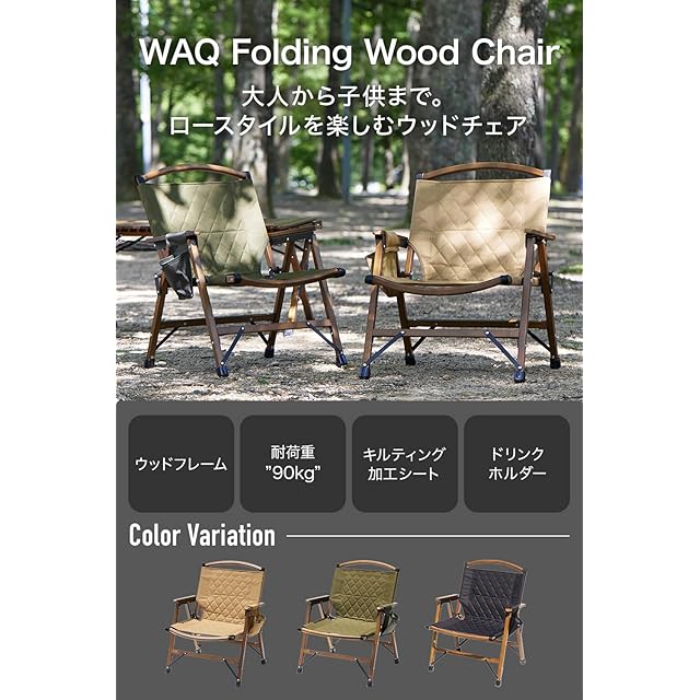 WAQ Folding Wood Chair フォールディングウッドチェア ローチェア 折りたたみチェア ウッドチェア キャンプチェア キャンプ椅子 ドリンクホルダー (2個セット(オリーブ))