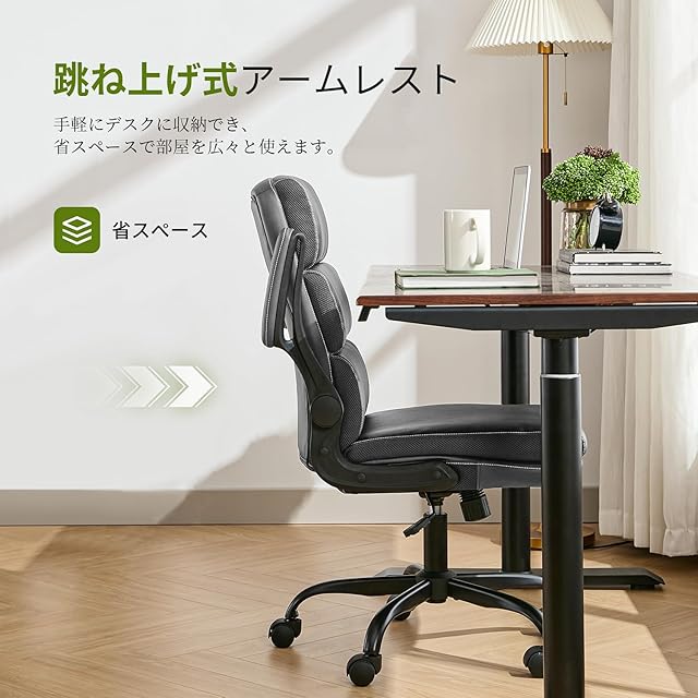 【跳ね上げ式アームレスト&消音キャスター】跳ね上げ式アームレストは90度回転可能です。使わないときはアームレストを折りたたんで机の下に収納でき、省スペースで部屋を広々と活用できます。また、ナイロン樹脂製のキャスターは、木製フローリング、タイル、カーペットなど、あらゆる床材に対応しています。床を傷つける心配がなく、長期間美しい状態を保てます。さらに、キャスターは静音設計でスムーズに移動でき、オフィスや自宅でも周囲を気にせず快適に使用できます。