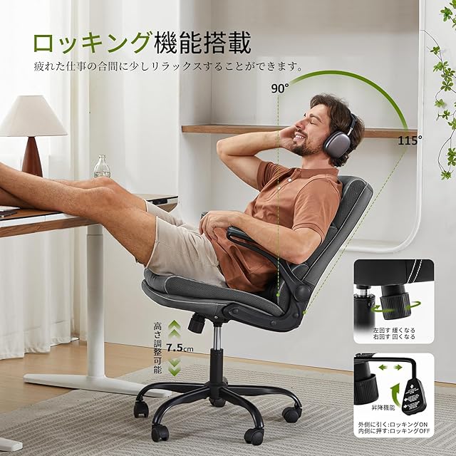 【ロッキング機能】椅子は8CM高さ調整可能、360°回転及び 90°-115°のロッキング機能を搭載しているため、仕事時もレジャー時も最も快適な高さと角度を提供します。座面右下のレバーを操作することで、高さを簡単に調整したり、背もたれを直立させたりすることができます。また、ロッキングの硬さも自由に調節できます。