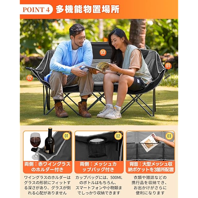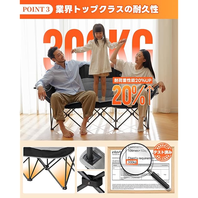【業界トップクラスの耐久性】①厚手で丈夫な600Dオックスフォードを採用した座面、強度・耐久性が高いです。②軽量ながら強度抜群のQ195スチールフレームは、大人3人分の体重+荷物 (最大300kg) を余裕でサポートできます。③フロントのダブルライザー構造により、サポートが強化されました。④鋼管を座面内部に通す設計により、座面の補強を実現し、耐久性を向上させました。⑤補強された耐荷重ブロックは、チェアに高い安定性を与えるよう設計されています。