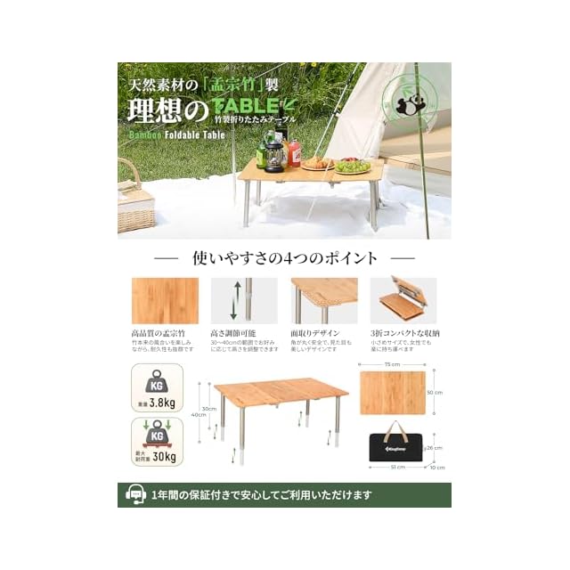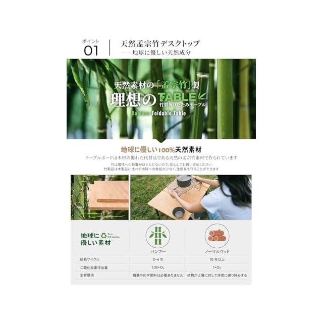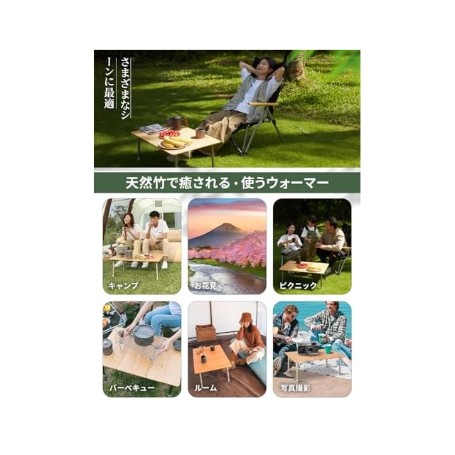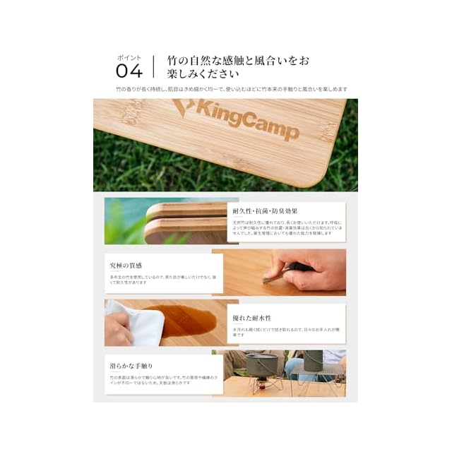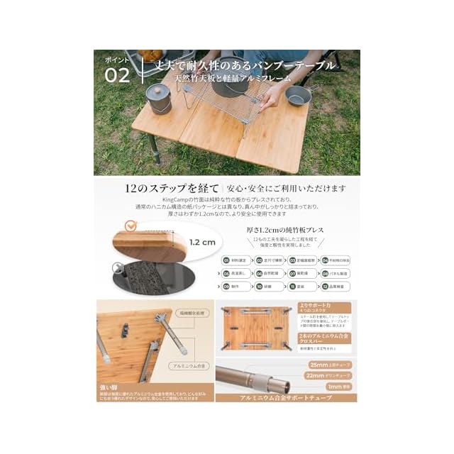 【高級な天然竹製天板】キャンプテーブルの天板は、自然の楠竹を使用し、12の工程を経て熟練の技で作り上げられています。楠竹は自然な美しさを持ち、耐久性にも優れており、日常の使用にも十分に耐えることができます。当社の職人たちは竹の工芸に精通しており、熟練した手仕事によって楠竹材料を滑らかなテーブル面に仕上げ、自然の木目と特有の質感を表現しています。あなたの生活空間に自然な美しさと高品質をもたらします。