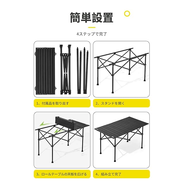【簡単な組み立て、すぐに使用可能】このテーブルは非常に簡単に組み立てることができます。まず、部品をすべて取り出し、スタンドを広げて安定させます。その後、ロール式天板を広げ、スタンドにしっかりと固定するだけで、数分で完成します。工具を使わずに、手軽に組み立てられる便利な設計です。