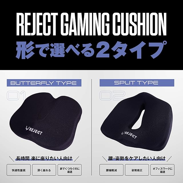 【プロeスポーツチーム監修】 REJECT クッション 椅子 腰痛 ゲーミングチェア オフィスチェア リモートワーク デスクワーク ゲルクッション 座布団 低反発 姿勢矯正 坐骨神経痛 GAMING CUSHION (SPLIT TYPE)