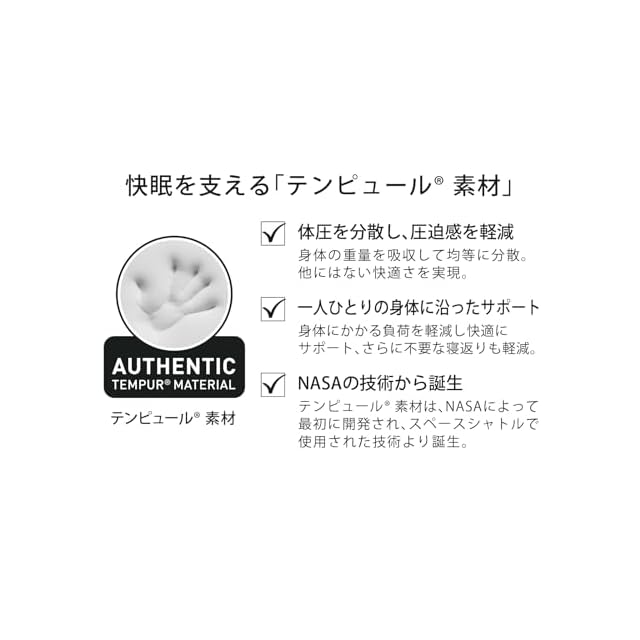 ブランド:NASAの認定を受け、米国宇宙財団の認証を受けた唯一のマットレス&ピローブランド。テンピュール(R) 素材は、NASAによって最初に開発され、スペースシャトルで使用された技術より誕生。信頼のデンマーク製。