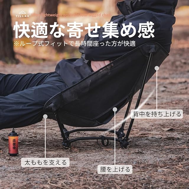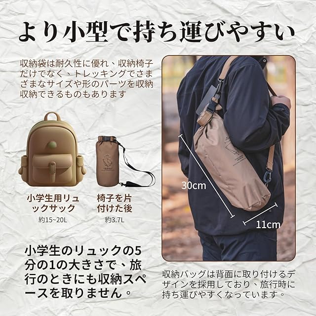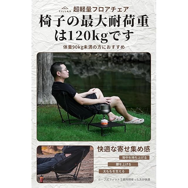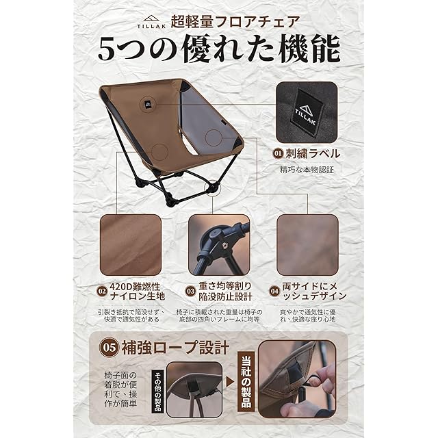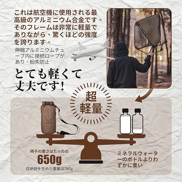 【強度と軽量化について】このチェアは7系航空グレードアルミニウム合金フレームを採用し、軽量化を実現しつつ、高い強度を両立しています。わずか650gの超軽量設計(飲料1本分の重量)でありながら、耐荷重120kgを実現。ハイキングやキャンプの移動時にも、非常に軽快にお運びいただけます。