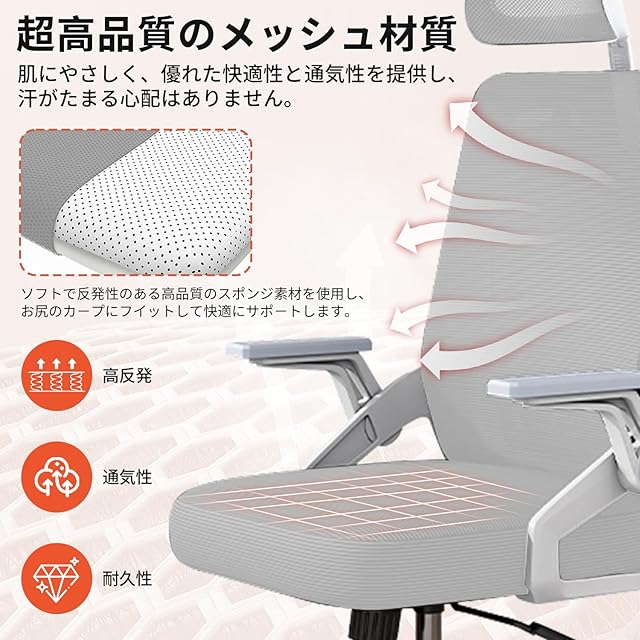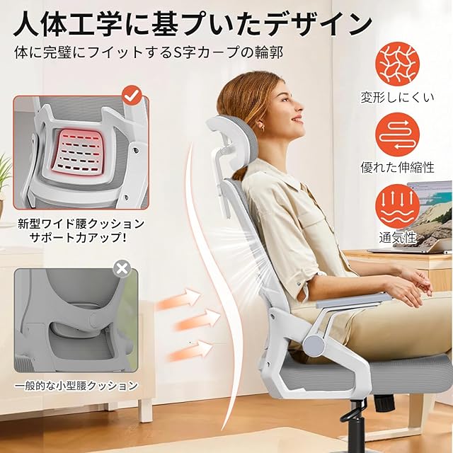 Sezlife オフィスチェア デスクチェア 人間工学 テレワークチェア 疲れない 椅子 腰サポート 跳ね上げ式アームレスト 3Dヘッドレスト ロッキング機能 高反発クッション PCチェア 通気性メッシュ ゲーミング/勉強/事務用 おしゃれ パソコンチェア (グレー)