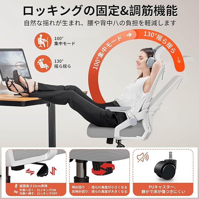 【人間工学設計·跳ね上げ式アームレスト】人間工学の概念に基づき、椅子はS型背もたれ設計を採用し、人体の曲線に一致する設計と同時に、全体の力点を有する。背骨をしっかりにサポートできて、座りっぱなしの腰に強い負担をかけず、安心して作業や勉強できます。アームレストは前後6CM調整と90度回転できるように設計されているため、使わないときはアームレストを引き上げて、どのデスクの高さにもすっきりと収納できるので、部屋のスペースを有効に活用できます!部屋、書斎、オフィス、会議室、応接室など幅広く利用可能なデスクチェアです。