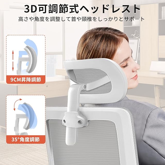 【リラックス背座ロッキング機能が搭載し】 椅子は30度ロッキング機能を搭載し、座面と背もたれが繋がっていているチェアは座面と背もたれが30度角度で同時に可動します。体を動かすことでゆらゆらと揺れている。長時間の仕事や勉強の合間に、リラックスした時間をお過ごし、ちよっと疲れてしまったとの気分転換ができます。角度調整可能な3Dヘッドレストを搭載し、高さは6CM、35°角度を調整でき、自分に適する高さや角度を調整して完全に頭部や首を支えることができき、頭と首の圧力を効果的にかんわします。
