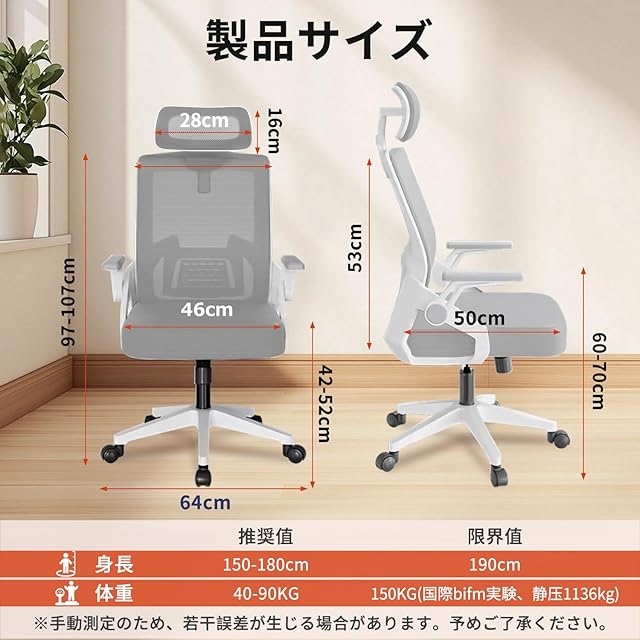 【10分間で簡単に組立可能・品質あり】オフィスチェアのサイズ:幅60×奥行60×高さ107-117cm(座面高:42-52cm)。本体重量は10kgで静止耐荷重は約150KGに達しており、ご安心して利用いただけます。日本語の取り付け説明書と工具が付属しており、痩せた女性でも10分以内に簡単に取り付け可能です。安心:万が一商品到着後、初期不良・破損・取り付け方法が不明等の場合はお気軽にご連絡ください。返品、返金、取り付けるビデオを送させていただきます。