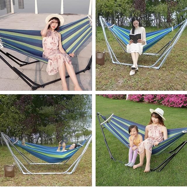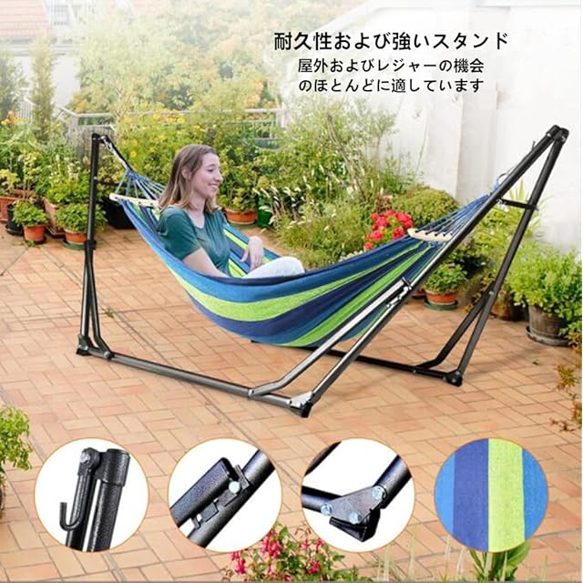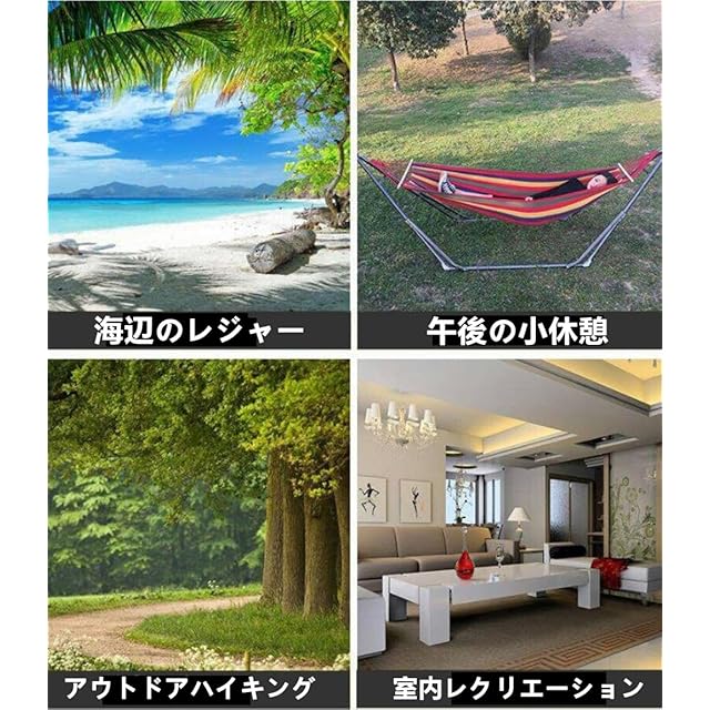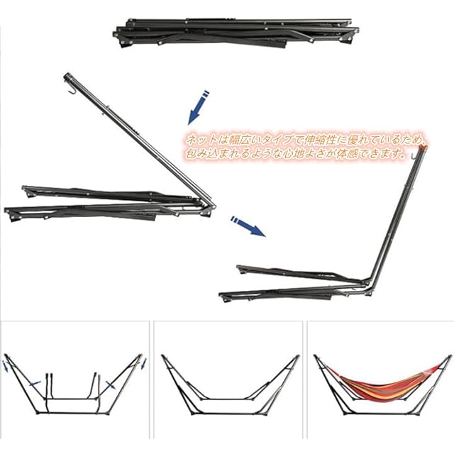 【収納袋付き】ハンモックスタンド・ネット一式が全部収納できる、 コンパクトに畳んで持ち運び楽々です。自立式なので、室内に限らず、海やキャンプなどのアウトドアにも、女性でも簡単に持ち運びできます。いつでもどこでも気軽にハンモックを楽しめます。