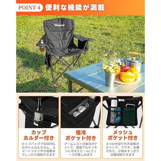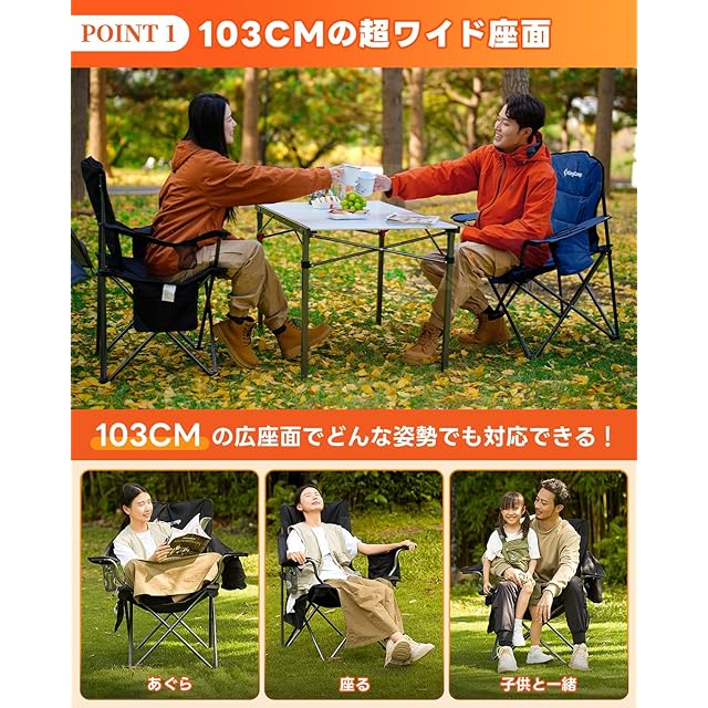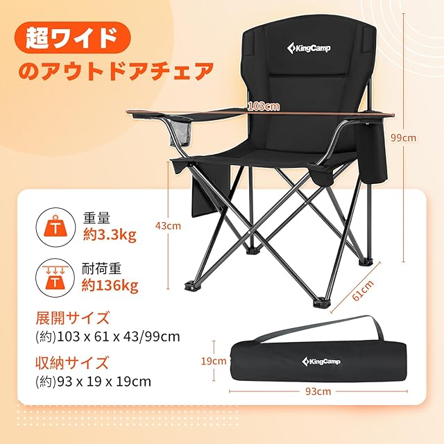 KingCamp アウトドア チェア 折りたたみ 椅子 キャンプ 超ワイド103cm 耐荷重136kg 保冷ポケット付き コットン入り 人間工学設計 公園 花火大会 運動会 釣り