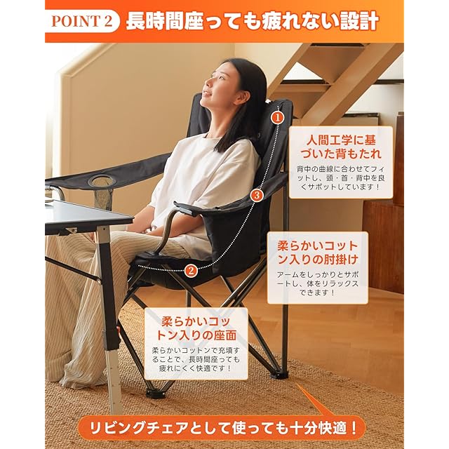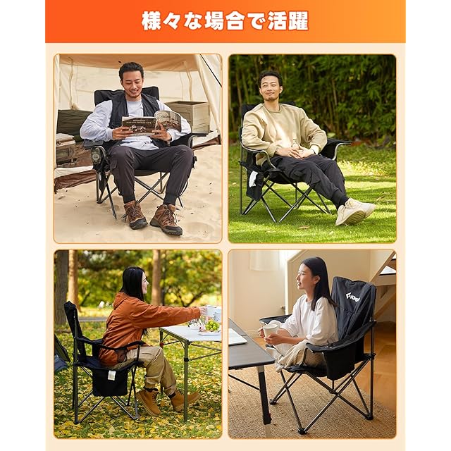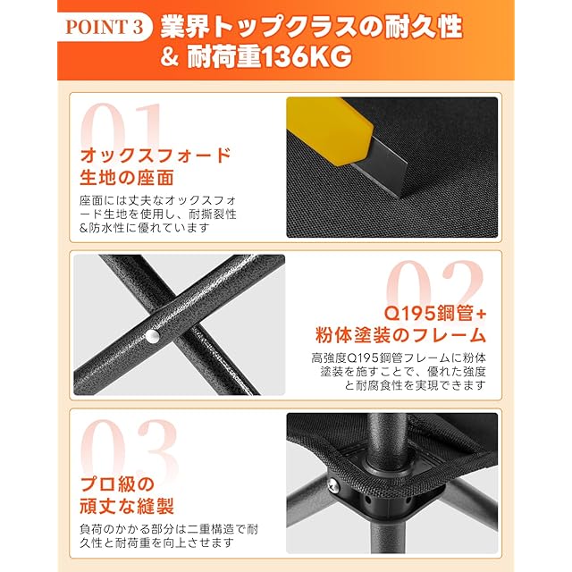 【業界トップクラスの耐久性】①厚手で丈夫なオックスフォードを採用した座面、強度・耐久性が高いです。②軽量ながら強度抜群のQ195スチールフレームは、大人の体重+荷物 (最大136kg) を余裕でサポートできます。③フレームと生地の接続部はプラスチックで補強されているので、突き破る心配がありません。④フレーム防錆加工済みなので、梅雨時期でもさびません。 ⑤様々な地形に対応する大型滑り止めキャップ付きで、砂浜や傾斜地でも安定感抜群です。