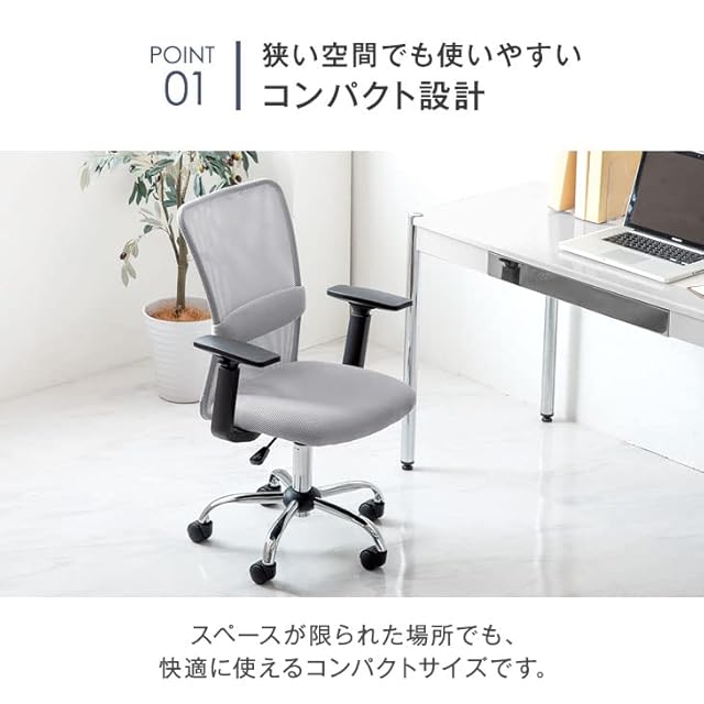 【スタッフのおすすめポイント!】 ・丁度いい高さに調整OK!昇降アームレスト ・狭い空間でも使いやすいコンパクト設計 ・通気性に優れたオールメッシュ ・腰を支えるランバーサポート付 ・スタイリッシュなクロムメッキフレーム