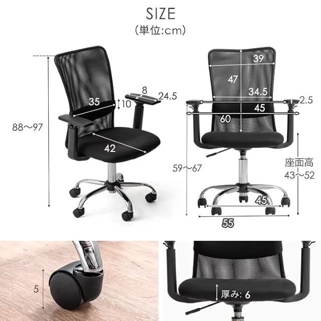 【素材】【張り地】オールメッシュ生地(ポリエステル100%) 【内部】ウレタンフォーム 【フレーム】スチール(クロムメッキ加工) 【キャスター】ナイロン