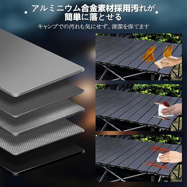 【防水・キャンプテーブル 折りたたみテーブル テーブル耐熱設計で全天候対応】 PU防水コーティング加工でIPX5防水等級を達成。水をこぼしても簡単に拭き取れます。120℃までの耐熱性があり、熱い鍋ややかんを直接置くことも可能。油汚れや腐食、キズにも強く、あらゆる天候条件下で耐久性を発揮します。