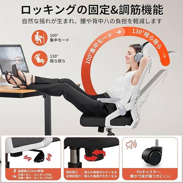 Sezlife オフィスチェア デスクチェア 人間工学 テレワークチェア 疲れない 椅子 腰サポート 跳ね上げ式アームレスト 3Dヘッドレスト ロッキング機能 高反発クッション PCチェア 通気性メッシュ ゲーミング/勉強/事務用 おしゃれ パソコンチェア (ホワイト)