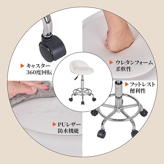 【商品仕様】■材質:PUレザー+スチール+ウレタンフォーム■カラー:ブラック/ホワイト■サイズ: 座面高さは 45- 62cmを調節でき、座面のサイズは幅36×奥行32×厚さ4.5cm、背もたれの高さは12cmです■重量:4.3kg■耐荷重:約120kg