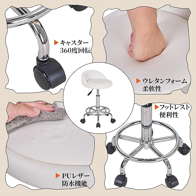 VECELO キャスター付き回転スツール 背もたれ低め 昇降タイプ 丸椅子 PUレザー フットレスト付 座面高さ45〜62cm 診察 エステ サロン スツール 約幅36×奥行32×高さ45〜62cm 重量約4.3kg【日本正規輸入品】