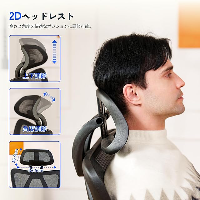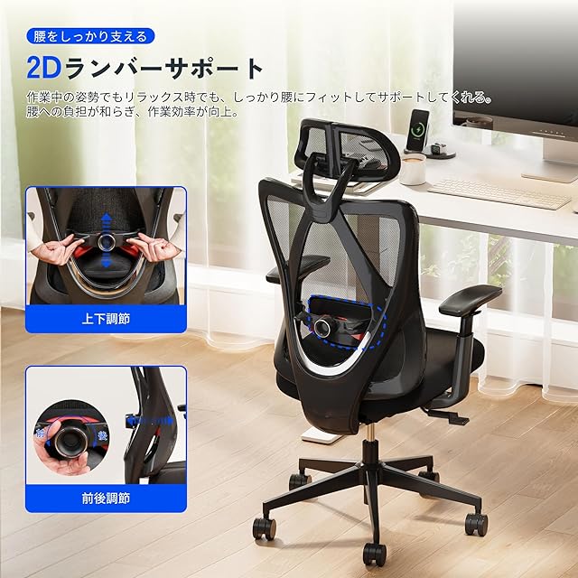【腰をしっかり支える・2Dランバーサポート】上下・前後が調節可能で、作業中の姿勢でもリラックス時でも、しっかり腰にフィットしてサポートしてくれる。腰への負担が和らぎ、作業効率が向上。