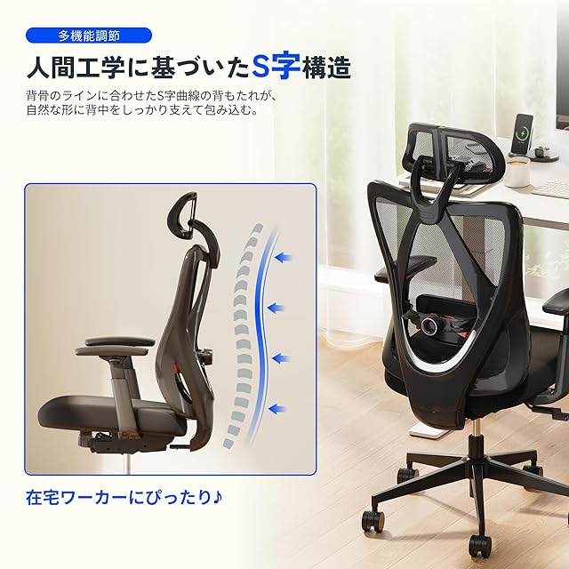 【人間工学に基づいたS字構造】背骨のラインに合わせたS字曲線の背もたれが、自然な形に背中をしっかり支えて包み込む。姿勢や作業環境に合わせて調整できるサポート機能が多数搭載、在宅ワーカーにぴったりのプロダクト。