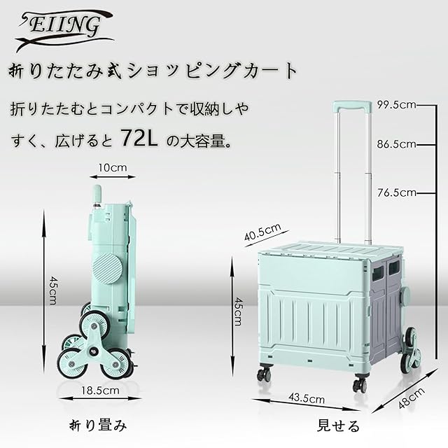 EIING ショッピングカート 折り畳み キャリーカート 軽量 買い物カート 多機能 アウトドアキャンプカート コンテナキャリー 耐荷重100KG 調整可能なドローバー 8輪360°回転 静音 キャスター ブレーキ付き 階段を楽に登る 3段階調整 携帯便利 簡単組立 コンパクト おしゃれ キャンプ用 車載用収納ボックス 旅行用品 頑丈 様々な路面に対応(ミントグリーン 8輪, 72L)