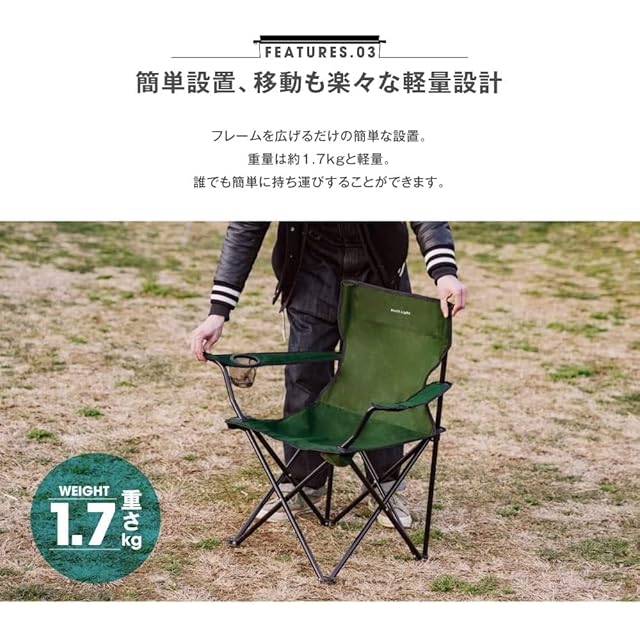 【仕様】 製品名:アウトドアチェア 材質:スチール(フレーム)、ポリエステル(座布) サイズ:組立時 約W82xD48xH78cm 収納時 約W81xD15xH15cm カラー:グリーン 重量:約1.7kg(1個あたり) 耐荷重:約100kg(1個あたり) 同梱品:本体、収納バッグ(ポリエステル製)
