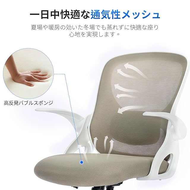 【高反発クッション&通気性抜群のメッシュ生地】デスクチェアの座面には、耐久性が高く型崩れがにくい高反発バブルスポンジを採用。もっちりとした高弾力で、長時間のデスクワークも快適にお尻をホールドします。背もたれと座面には、通気性の良いメッシュ素材を採用しました。メッシュの背もたれは空気を自由に流れさせ、汗を防ぎ、背中を涼しく保ちます。夏場や暖房の効いた冬場でも蒸れずに快適な座り心地を実現します。テレワークや勉強、オフィスワークに最適です。