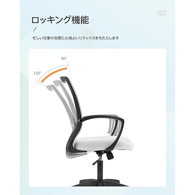 多機能で自分好みに調整:高さ8cmの昇降機能で、たくさんのデスクにピッタリ。120°ロッキング機能で仕事の合間にリラックスでき、疲れをリセット。勉強や仕事の効率を上げたいあなたに、自由な使い心地を提供します。オフィスチェアや勉強椅子として、在宅勤務や応接室でも効率を高める。自分好みの快適さを提供するチェアです。