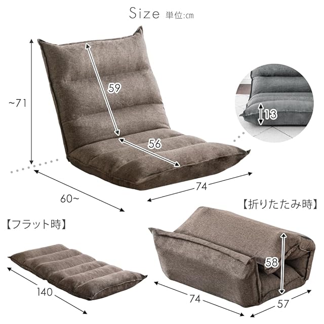 【サイズ】フラット時:幅54×奥行138×厚み10~13cm / リクライニング時:幅54×奥行70×高さ68cm ※サイズはカバー生地の端まで含めた寸法です。