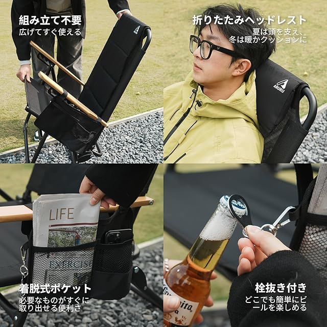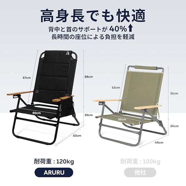ARURUキャンプ椅子 リクライニング | 折りたたみ式・4段階調節 | 全季節快適・温かいクッション & ブナ材肘掛け | アウトドア・バーベキュー・焚き火対応
