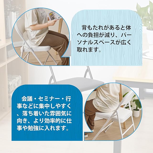 【背もたれ付き】背もたれがあると体への負担が減り、パーソナルスペースが広く取れるので、会議・セミナー・行事などに集中しやすく、落ち着いた雰囲気に向き、より効率的に仕事や勉強に入れます。