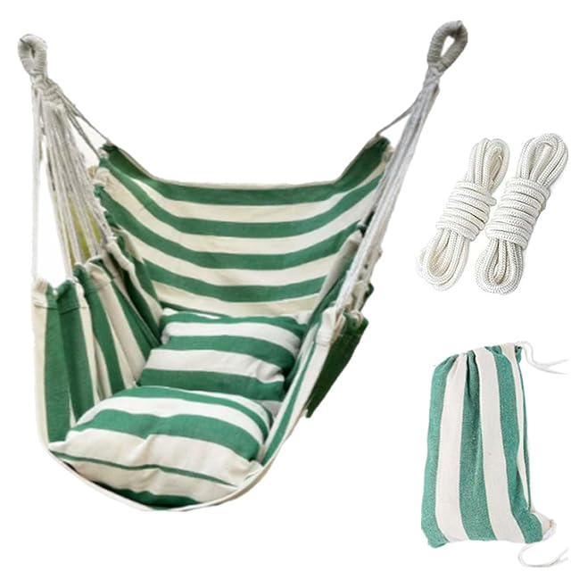 サムコス ハンモック チェア ハンガーラックスイングチェア ハンモック室内 室外 兼用 折りたたみ ハンギングチェア 公園 アウトドア キャンプ ポール 吊り下げ 吊り椅子丈夫なロープ/抱き枕付き(緑と白ストライプ、棒がない)