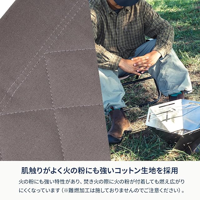 ✅【肌触りの良いコットン生地】 本体生地には肌触りの良いコットン(綿)を採用。火の粉にも強い特性があり、焚き火の際に火の粉が付着しても燃え広がりにくくなっています(※難燃加工は施しておりませんのでご注意ください)。