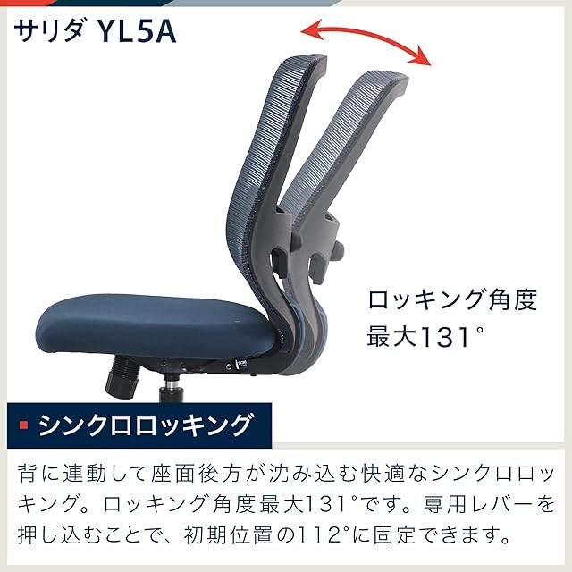 【シンクロロッキング】背に連動して座面後方が沈み込む快適なシンクロロッキング。ロッキング角度最大131°です。専用レバーを押し込むことで、初期位置の112°に固定できます。
