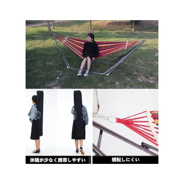 【収納袋付き】ハンモックスタンド・ネット一式が全部収納できる、 コンパクトに畳んで持ち運び楽々です。自立式なので、室内に限らず、海やキャンプなどのアウトドアにも、女性でも簡単に持ち運びできます。いつでもどこでも気軽にハンモックを楽しめます。