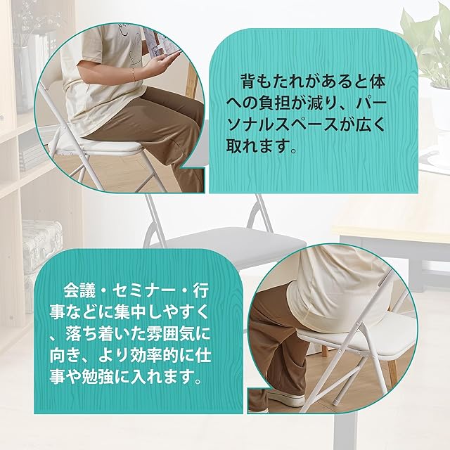 【背もたれ付き】背もたれがあると体への負担が減り、パーソナルスペースが広く取れるので、会議・セミナー・行事などに集中しやすく、落ち着いた雰囲気に向き、より効率的に仕事や勉強に入れます。