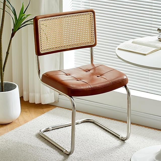 Erinotto ダイニングチェア ラタン 食卓椅子 籐編み 学習椅子 木製 コーヒーチェア カフェチェア 背もたれ付き 肘なし 北欧風 おしゃれ レトロ 軽量 金属製の足 合成革 お手入れ簡単 リビング 在宅ワーク 組立簡単 (肘なし, ブラウン(背もたれ)xダークブラウン(PU座布団))
