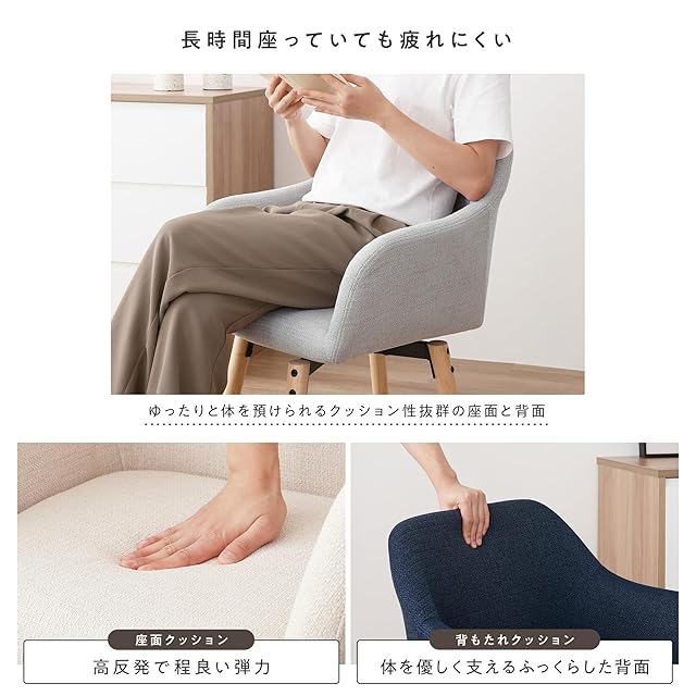 【立ち座りがしやすい回転式チェア】ダイニングチェアroistoは360度回転する座面を備えた機能的なデザインが特長。立ち上がる際や座る際、また振り向く動作が非常にスムーズに行えます。椅子を引かずにその場でくるっと回転できるため、床を傷つける心配もなく、安心して使用できます。なだらかな流線形を描く座面、背面、アームレストは、体を優しく包み込むように設計されています。曲線フォルムが、包み込まれるようなフィット感を実現し、長時間座っていても疲れにくい、心地よさと機能性の両立を追求しました。