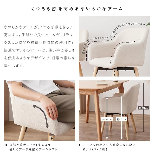 【ゆったり座れるサイズ感、くつろぎ感を高めるなめらかなアーム】ゆったりとしたサイズ感で、リラックスした時間を過ごせます。広めの座面が体をしっかりと支え、快適な座り心地を提供。ダイニングチェアとしてだけでなく、書斎やオフィスなどでのデスクチェアとしても活躍します。なめらかなアームが、くつろぎ感をさらに高めます。手触りの良いアームが、リラックスした時間を提供し長時間の使用でも快適です。そのアームは、使い手に優しさを伝えるようなデザインで、日常の癒しを提供します。